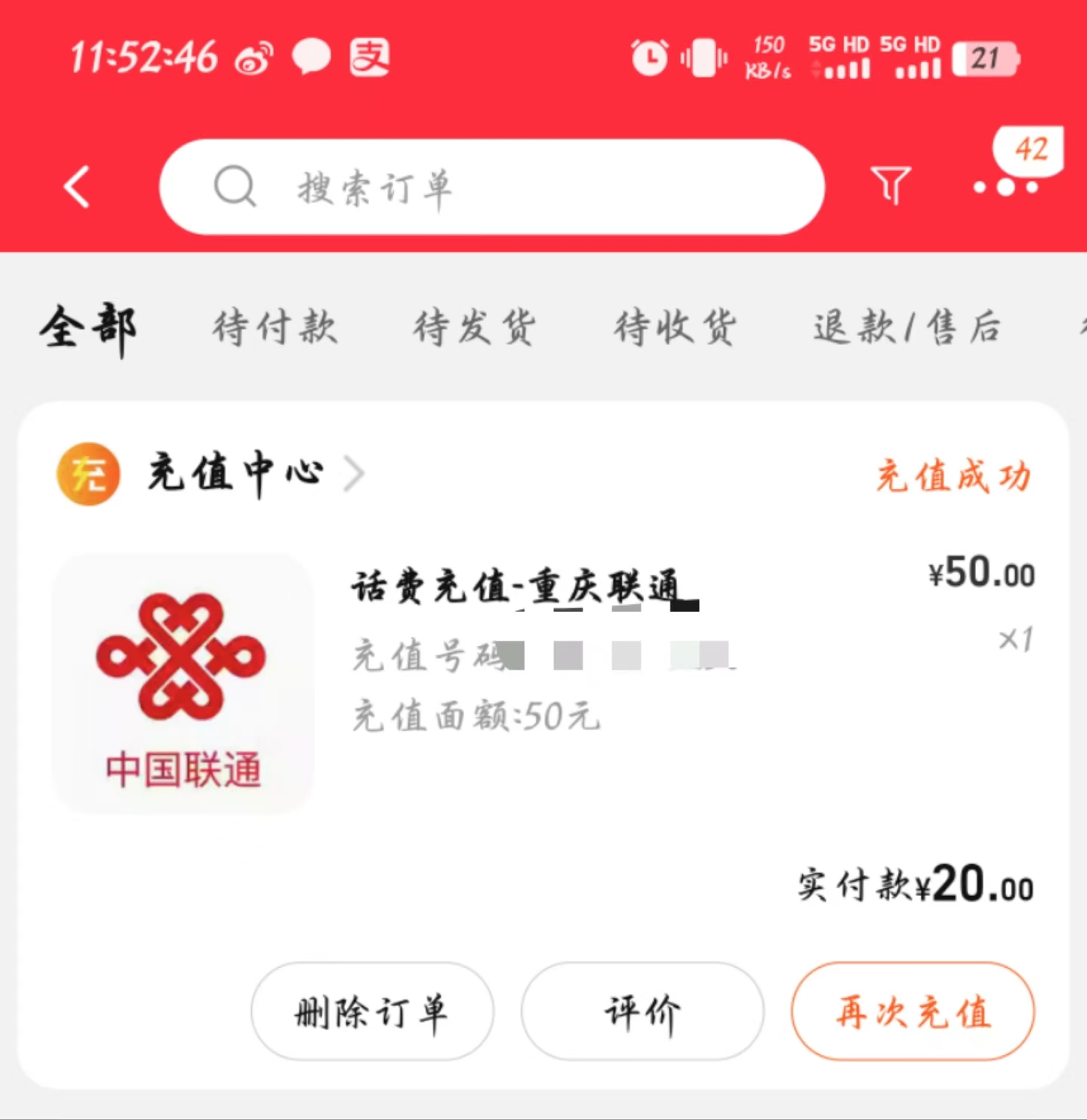 4折充话费支付宝20充50话费 值得一看 24年11月11日 编辑 admin顶级老司机 取消关注 关注 私信 4折充话费支付宝20充50话费 拿不常用的zfb小号,先把号上的yh卡解绑(没绑的号最好) 然后淘宝app点充值中心,自动弹30话费券,0充30话费或者20充50话费 这个一直能玩 给TA打赏 共{{data.count}}人 人已打赏