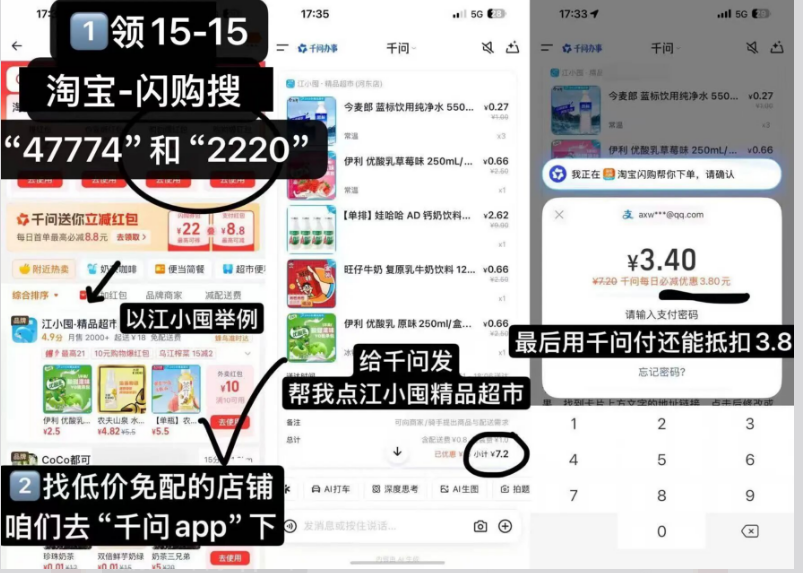 ②两个都领了后,先用闪购看看15-15能抵扣哪个店铺,再去千问app 发我想买***店的商品