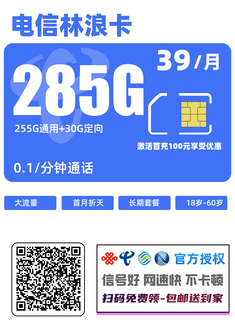 电信林浪卡39元255G通用+30G定向+0.1元/分钟 长期套餐(首月按天,体验金不转结,流量可结转,下单年龄18-60周)