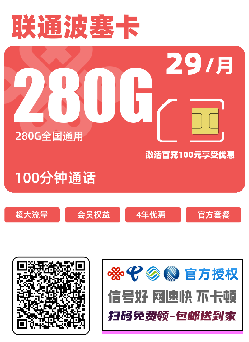 联通波塞卡【必须首充100】29元280G通用流量+100分钟通话+会员权益选1(4年优惠,必须一次性充值100,年龄18-28周岁,会员权益N选1)