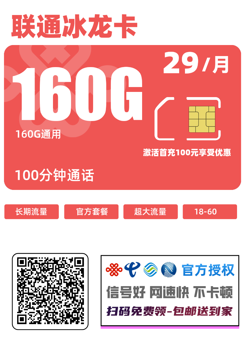 联通新冰龙卡【爆款下架快】29元160G通用+100分钟通话【29长期】(2029年后自动续约,禁直播,自助激活)