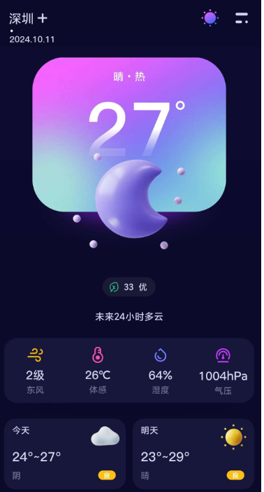 【应用介绍】超准天气预报信息实时精准,覆盖内容全面,字体大小随意调节,有大字版~浅色(白天)/深色(夜间)两种模式一键切换!界面清爽舒适,信息一目了然!