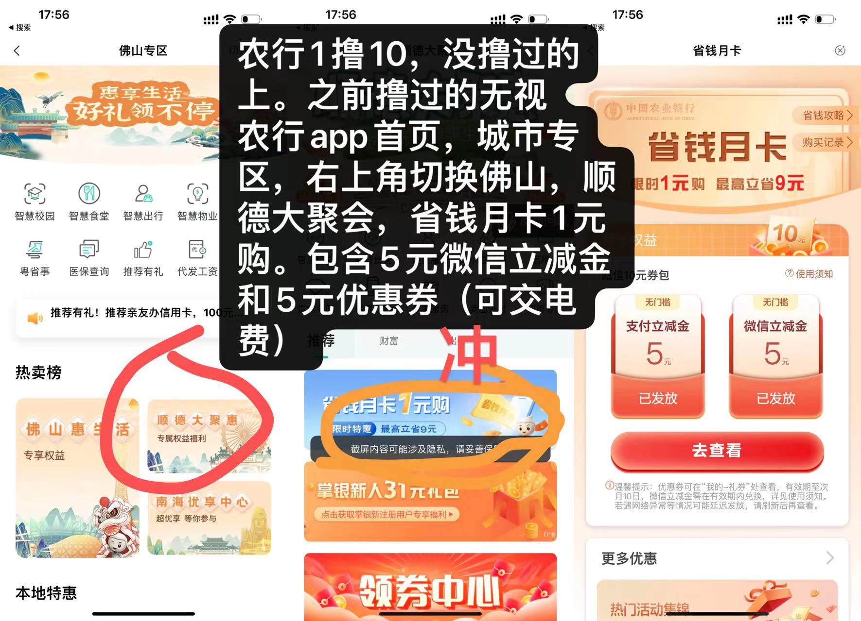 农行1撸10,没撸过的上 线报 7月31日 admin顶级老司机 取消关注 关注 私信 农行1撸10,没撸过的上。之前撸过的无视 农行app首页,城市专区,右上角切换佛山,顺德大聚会,省钱月卡1元购。包含5元微信立减金和5元优惠券(可交电费),具体参照活动说明。
