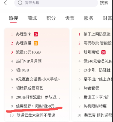 联通号码领60-50话费券 线报 2月07日 admin顶级老司机 取消关注 关注 私信 联通号码领60-50话费券 1、中国联通app首页顶部搜索点进去下面热门搜索 2、看图一标注信用延停限时领50元那个点进去开通 3、这个开通失败也给50的