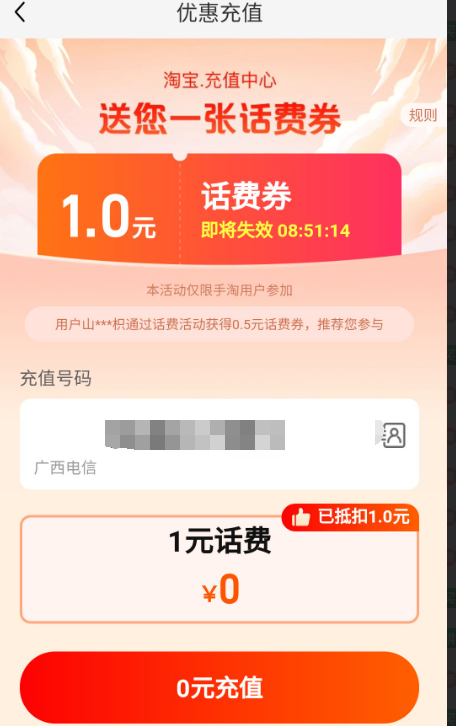 淘宝0元充话费方法 每天可重复充 线报 5月17日 admin顶级老司机 取消关注 关注 私信 联通、电信0撸2-3块话费-速度 1、淘宝APP-充值中心-弹窗-0元充联通 电信话费 2、冲完点辱羊毛进入,领一下能量和随便做下任务,会弹出一个领惊喜名字绿色能量球,点一下又会弹话费窗。有时出一个有时两个。